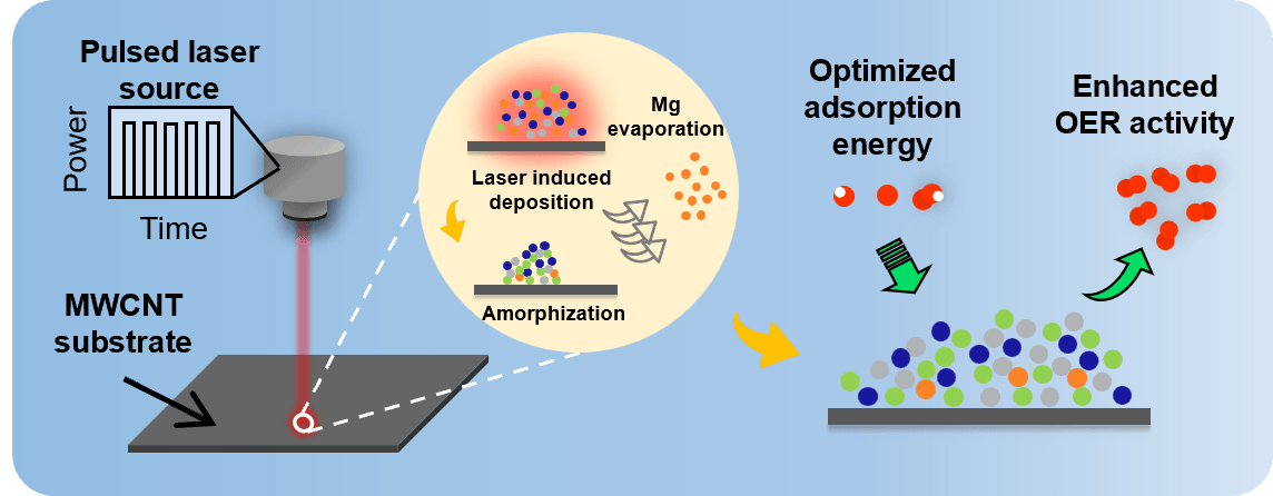 Multi-principal element alloys (MPEAs) have been recognized as emerged electrocatalysts that facilitate the high efficiency for oxygen evolution reaction (OER). With the noble metals free, they are cost-effective and a potential candidate to replace the traditional RuO2 and IrO2. The catalysis can be further improved through the construction of their lattice structures. This study proposes an innovative approach which makes use of pulsed laser irradiation to synthesize nano-sized amorphous MPEA particles. The low-boiling-point element Mg is incorporated with Fe, Co and Ni to synthesize MPEAs (FeCoNi)1-xMgx (x=0.05, 0.15, 0.25, 0.35). The high thermal temperature generated during the interaction between the laser beam and MPEAs gives rise to the evaporation of Mg leading to the amorphization. The increase of Mg content intensifies the amorphization extent. (FeCoNi)0.65Mg0.35 achieves a lower overpotential (256 mV@10 mA/cm2) for OER compared to the crystal counterparts and demonstrates long-term catalytic stability. Theoretical calculations reveal that amorphization strengthens OOH* adsorption energy due to improved charge transfer. This research provides insights into novel synthesis strategies and the catalytic mechanisms of amorphous alloys. Keywords: multi-principal element alloys (MPEAs), amorphization, pulsed laser irradiation, oxygen evolution reaction (OER), electrocatalysts.